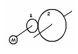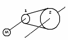 2. En siguiente sistema de transmisión, el eje del motor gira a 1.000 r.p.m. Calcular la velocidad de giro de la polea 2 si el diámetro de la polea 1 es 10 cm y el de la polea 2 es 20 cm. Indicar el sentido de giro de ambas poleas. El sistema, ¿es reductor o multiplicador de velocidad?