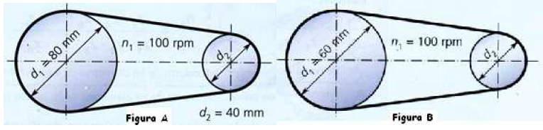 9. Calcula la velocidad de la rueda conducida del sistema de transmisión representado en la figura A y el diámetro de la polea conducida en el sistema de transmisión representado en la figura B para que gire a 300 r.p.m.