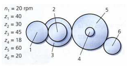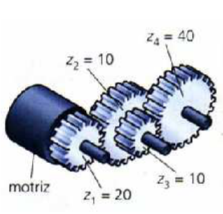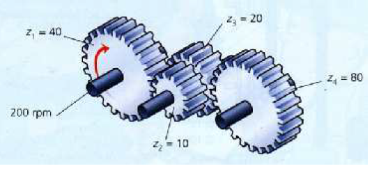 11. Calcula la velocidad de salida del sistema de engranajes de la figura cuando la rueda motriz gira a 100 r.p.m