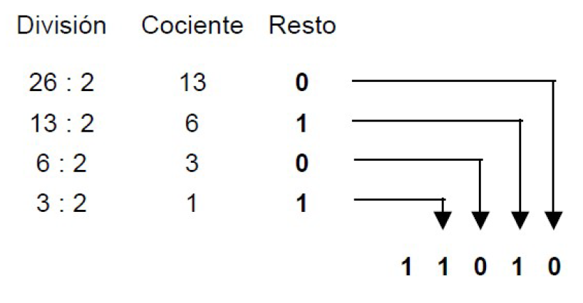 El número binario estará formado por un 1 seguido de los restos ordenados de las sucesivas divisiones. El orden de colocación viene determinado por la siguiente regla: “el resto de la primera división corresponde al bit menos significativo (el situado más a la derecha)”.