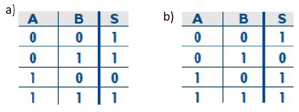 42. Obtén la tabla un circuito lógico que admita a su entrada dos números binarios A y B, de 2 bits cada uno, e indique a su salida si A>B, si A<B o si A=B.