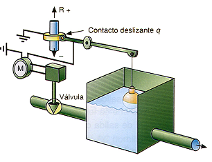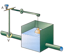 Ejemplo: Sea un depósito de agua en el que se desea que el caudal de entrada sea igual al de salida. Esto lo queremos conseguir a base de mantener el nivel constante en el depósito por medio de la válvula de control “V”. Con el tornillo “A” se fija el punto de ajuste para el nivel deseado.