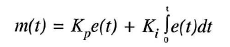 Para solventar el problema que presentan los controladores integrales, se recurre a combinarlo con un controlador proporcional, obteniendo un controlador proporcional e integral (PI). La salida del bloque de control PI responde a la ecuación: