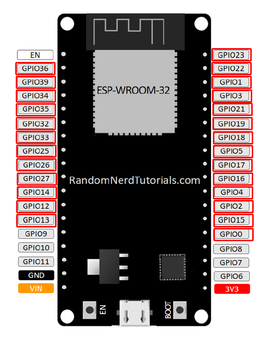 Con una placa ESP32, todos los pines resaltados, en la siguiente figura, con un rectángulo rojo pueden configurarse como pines de interrupción:
