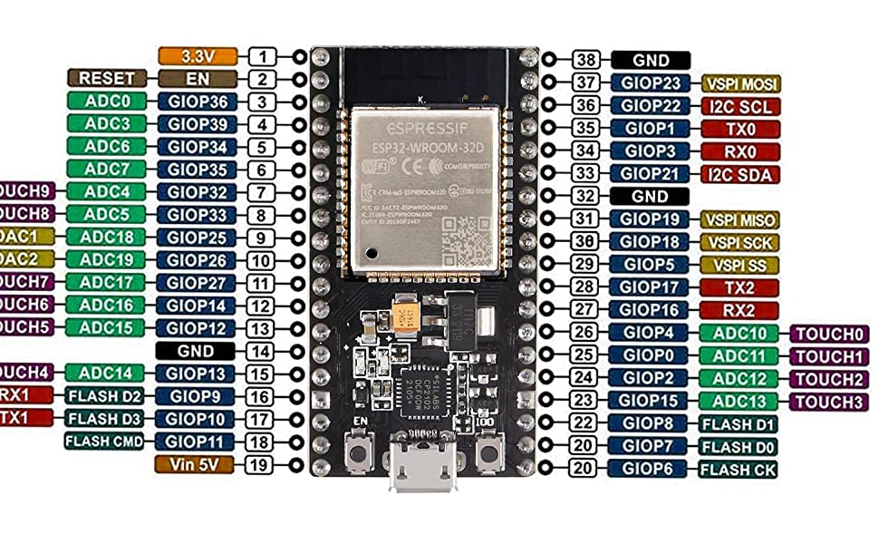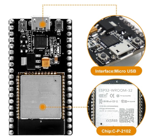 El chip ESP-WROOM-32. Tiene un regulador de voltaje de 3,3 V que reduce el voltaje de entrada para alimentar el chip ESP32. También incluye un chip CP2102 que permite conectar el ESP32 a la computadora para programarlo.